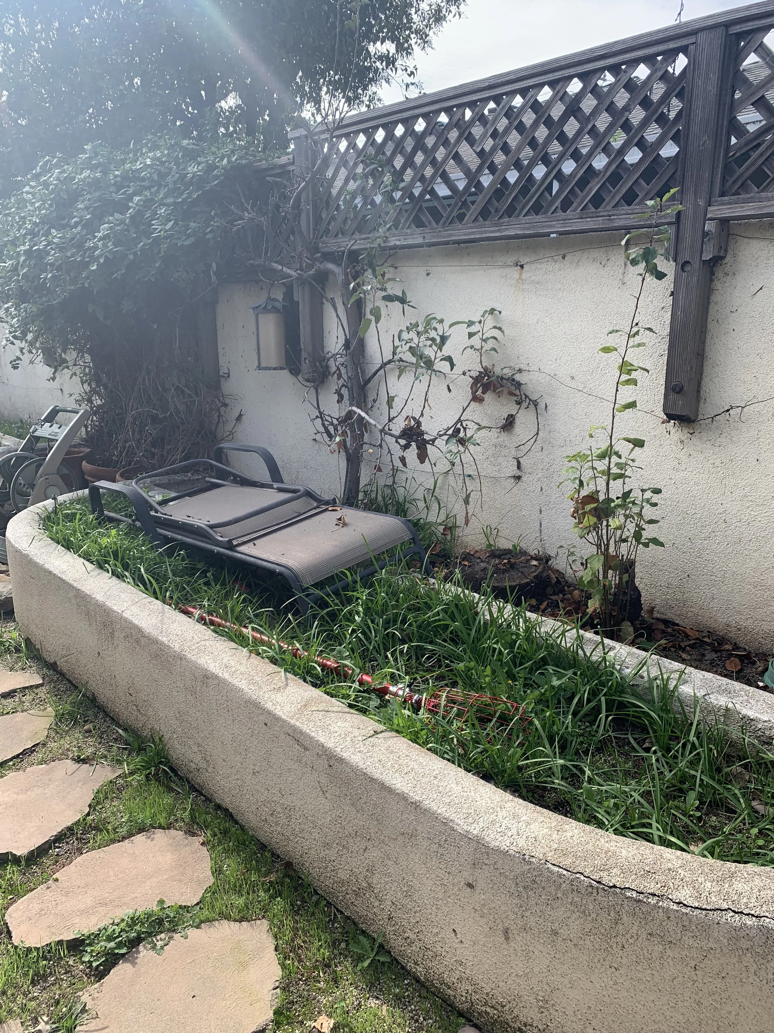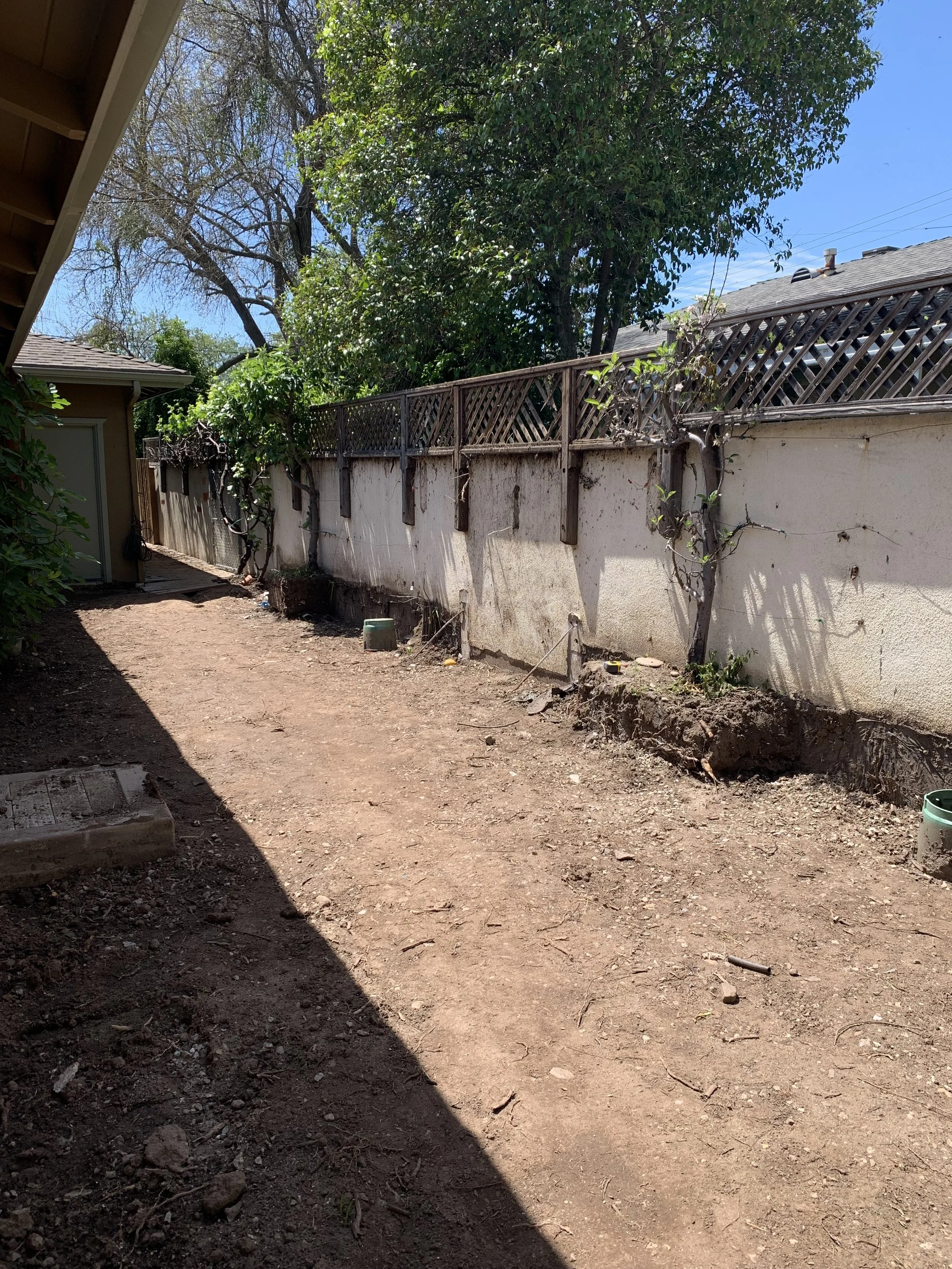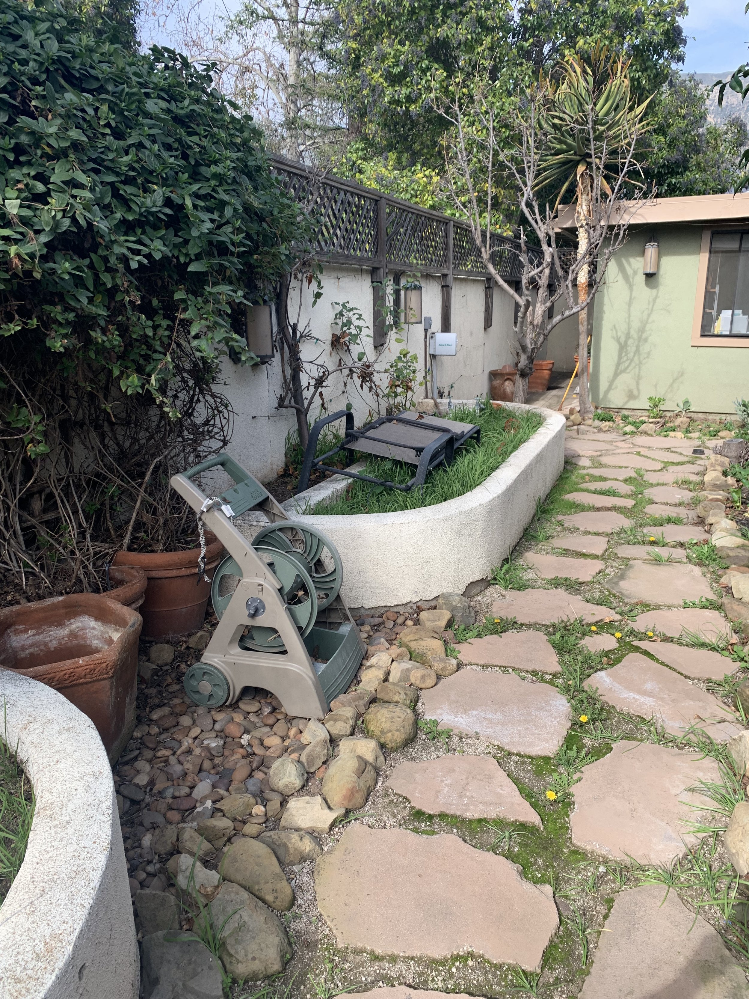Once filled with uneven stone pathways and oversized concrete planters; this generous side yard was reimagined as a natural, family-friendly garden. Two smaller raised beds built from stone found on the property now frame a repurposed teak bench, creating a cozy nook among native plantings and existing fruit trees. Designed to attract pollinators and invite play, the garden includes a dirt-digging area for kids — blending beauty, function, and a sense of everyday joy.